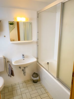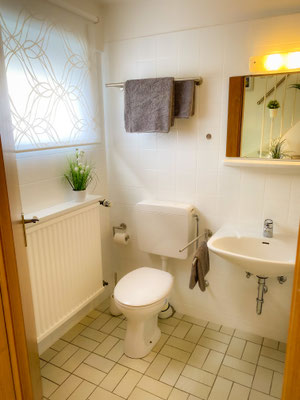 Im Tageslichtbadezimmer stehen eine Duschbadewanne, Föhn und natürlich Handtücher zur Verfügung.