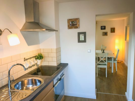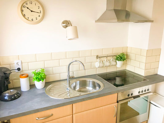 In der vollständig ausgestatteten Küche kannst du dich selbständig versorgen. Mit offenem Zugang zum großzügigen Wohnzimmer steht dir in der hellen Küche alles was Du benötigst rund um die Uhr zur Verfügung:
